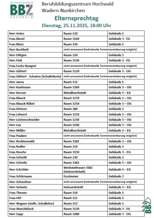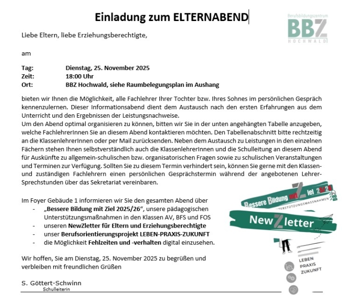 Elternabend am 24. November 2025 am BBZ Hochwald