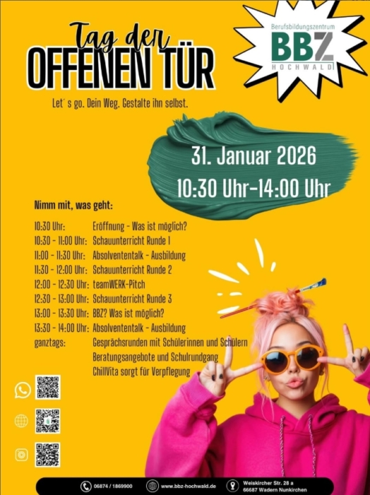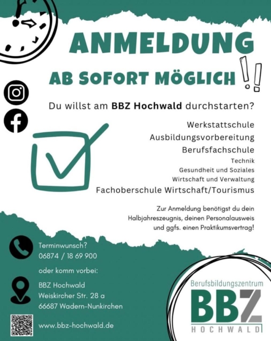 Mit dem BBZ Hochwald WhatsApp Kanal immer wissen, was los ist. Zusätzlich zu unserer Webseite und den Social Media Kanälen bieten wir euch die Möglichkeit, die wichtigsten Infos direkt über WhatsApp auf das Handy zu bekommen – und ihr bleibt dabei völlig anonym. Termine, News und Erinnerungen – hier werdet ihr auf dem Laufenden gehalten. Nutzt den Link: tinyurl.com/3J3J4EAW oder scannt den QR-Code!